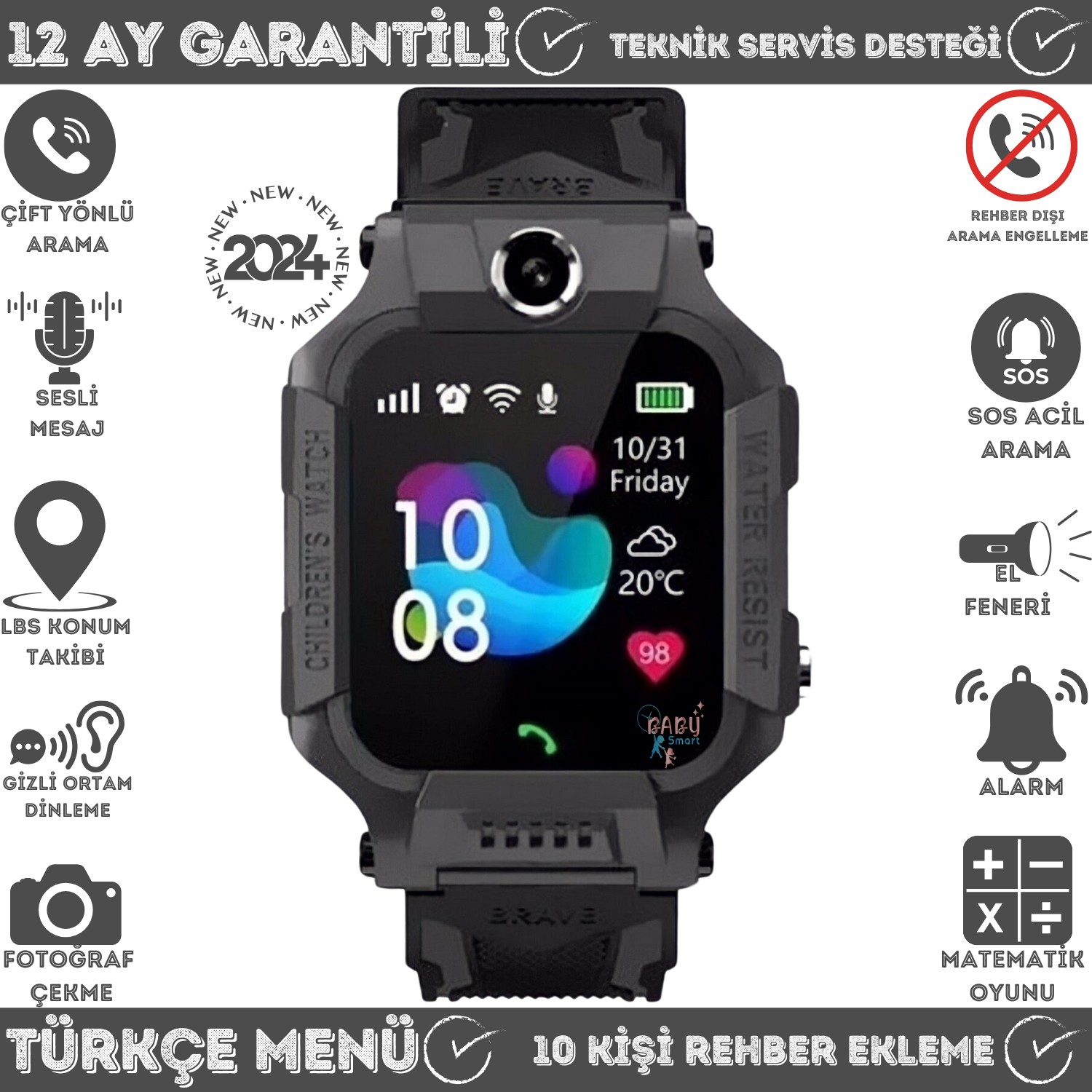 BabySmart Akıllı Çocuk Saati Sim Kartlı Kameralı LBS ve SOS Özellikli TÜRKÇE Bazı Akıllı Çocuk Saatleri Yurtdışından Doğrudan Getirilip satışa sunulduğu için IMEI Kayıtlı olmayabilir. Bu durum ileride Saatinizin kapanmasına ya da arıza yapmasına neden olabilir. Bu tarz durumlarda karşınızda muhatap bulamayabilirsiniz. AKILLI ÇOCUK SAATİNİZLE NELER YAPABİLİRSİNİZ ? Eğlenceli Matematik Oyunu: Çocuğunuzun Eğlenceli zaman geçirmesi için ve eğlenirken öğrenmesi için Akıllı Çocuk Saati için oynaya bileceği oyun mevcuttur. Ders Modu: Çocuğunuz okulda ise rahatsız edilmesini veya Saat ile meşgul olmasını istemiyorsanız ders modunu seçebilirsiniz. Alarm: Çocuğunuzun uyanması için veya farklı görevleri yerine getirmesi için alarmlar kurabilirsiniz. Uzaktan Dinleme: Çocuğunuzun haberi olmadan etrafındaki sesleri ondan habersiz dinleye bilirsiniz. Uzaktan Kamera: Çocuğunuzun haberi olmadan etrafındaki olayları ondan habersiz görüntüleye bilirsiniz. Harita Üzerinde Konum: Çocuğunuzun nerede olduğunu Akıllı Telefonunuzdan anlık olarak harita üzerinden görebileceksiniz. Karşılıklı Konuşma ( Telefon özelliği ): Uygulama üzerinden daha önce belirleyeceğiniz 10 kişiyi arayabilir. Sadece bu kişiler ile görüşebilir. Sizin belirlediğiniz numaralar dışında hiç kimseyi arayamaz - aranmaz. Karşılıklı olarak çocuğunuz ile telefon görüşmesi yapabilirsiniz. Sesli Mesaj: Çocuğunuz ile karşılıklı olarak SESLİ MESAJ bırakabilirsiniz. Çocuk size Sesli mesaj gönderebilir Çocuğunuz S.O.S düğmesine 3 saniye boyunca basılı tutarak, SOS Acil arama: “S.O.S” konumuna geçer. S.O.S konumunda, Acil olarak saat üzerinden çocuk sizi telefonunuzdan arar. Siz cevap vermez iseniz, diğer belirlenen kişileri sırası ile arar. Çocuk size konumunu uyarı mesajı ile telefonunuza gönderir. Elektronik ÇİT - Alan dışına çıkma: Çocuğunuzun sizin tarafınızdan belirlenen yerde olup olmadığını anlık olarak kontrol edebilirsiniz. Eğer o bölgeden ayrılırsa size mesaj ile uyarı gelecektir. Elektronik Bariyer özelliği ile; Çocuğunuzun, Evden ,Okuldan ,Kurstan , Kreşten, AVM den ayrılıp ayrılmadığını kontrol edebilirsiniz Geçmiş Konum - Ayak izi: 30 gün geriye dönük olarak çocuğunuzun nereye , hangi gün ,saat kaçta gittiğini orada kaldığını uygulama üzerinden takip edebilir , her zaman harita üzerinden görüntülersiniz. Saat şarjı azaldı uyarısı: Saatin şarjının %10'un altına düşmesi durumunda sizlere mesaj ile uyarı gönderilir. Saat uzaktan kapatma: Saat tanımlama yapıldıktan sonra veya saate sim kart takıldıktan sonra, saat üzerinden şarjı bitmedikçe kapatılamaz. Saati sadece uzaktan uygulama üzerinden siz kapatabilirsiniz. ÖNEMLİ NOT: SAATLER KONUMU İNTERNET ÜZERİNDEN ALDIĞI İÇİN, KONUM SAPMALARI VEYA HATALI KONUM GÖSTERMESİ TAMAMEN OPARATÖR KAYNAKLIDIR. BULUNDUĞUNUZ BÖLGEDE HATTIN NE KADAR İYİ ÇEKTİĞİNE GÖRE DEĞİŞKENLİK GÖSTEREBİLİR.