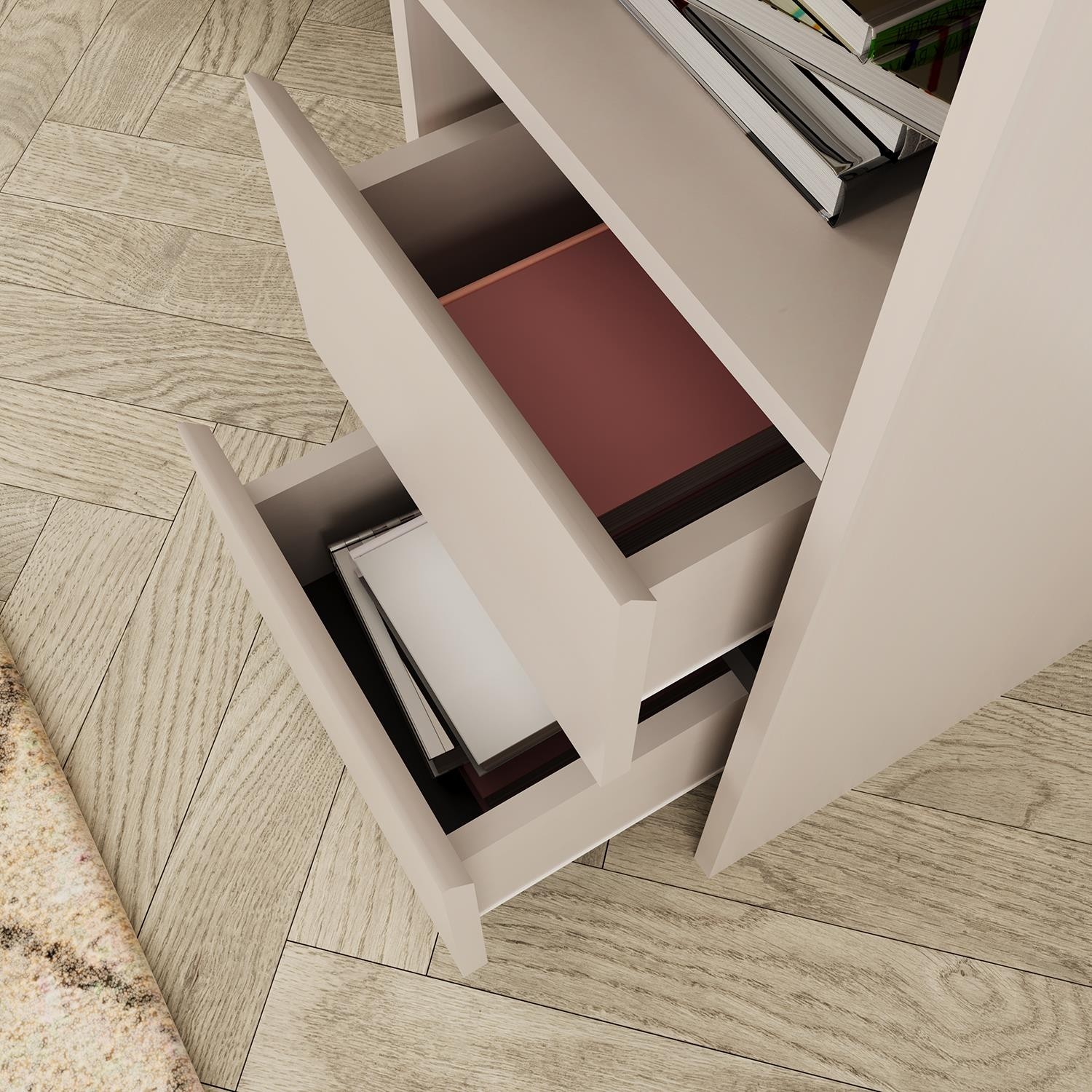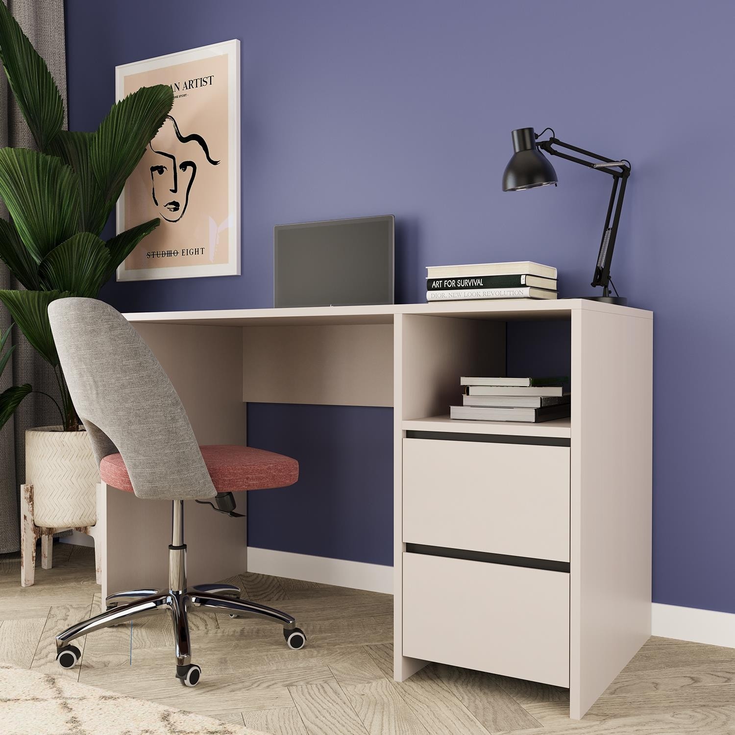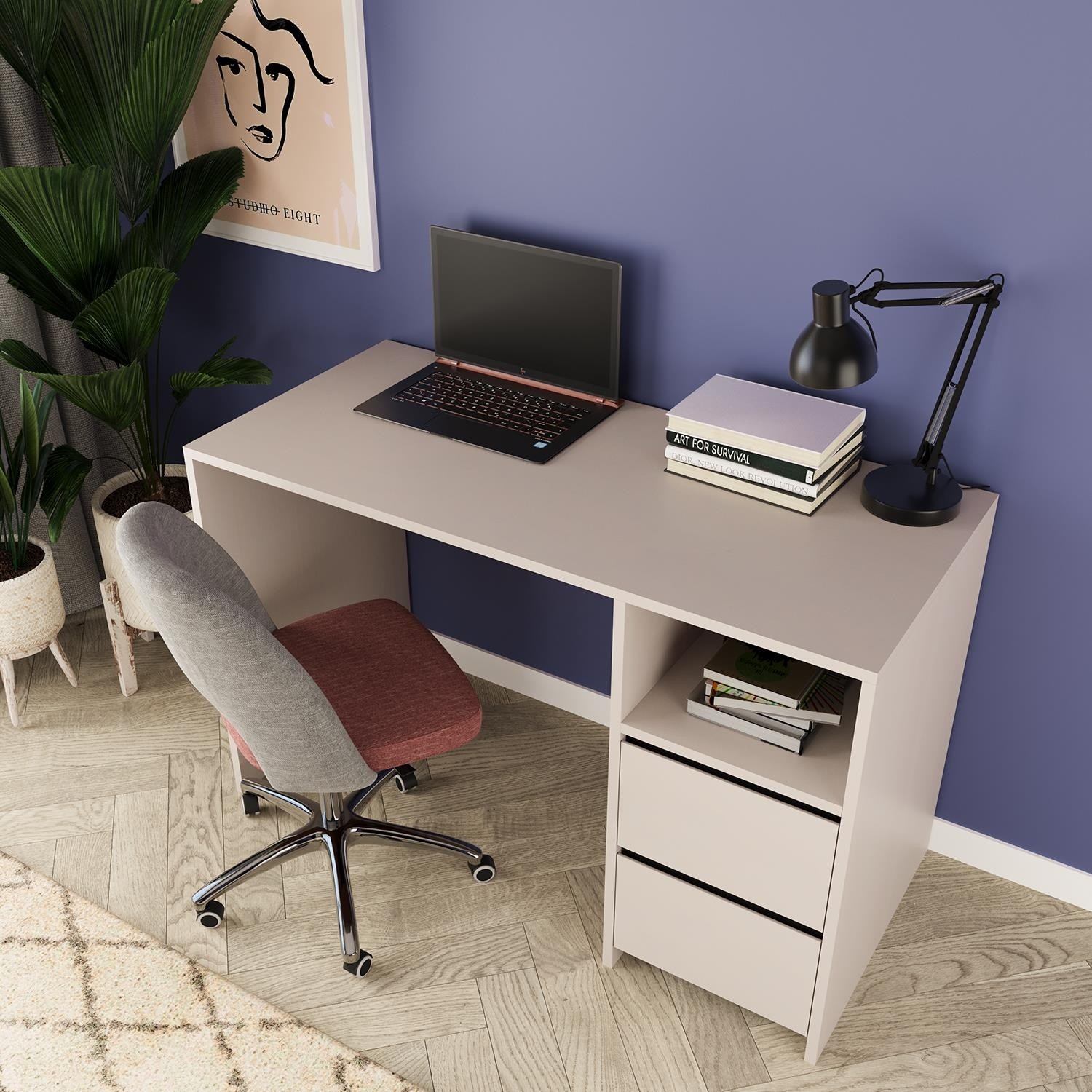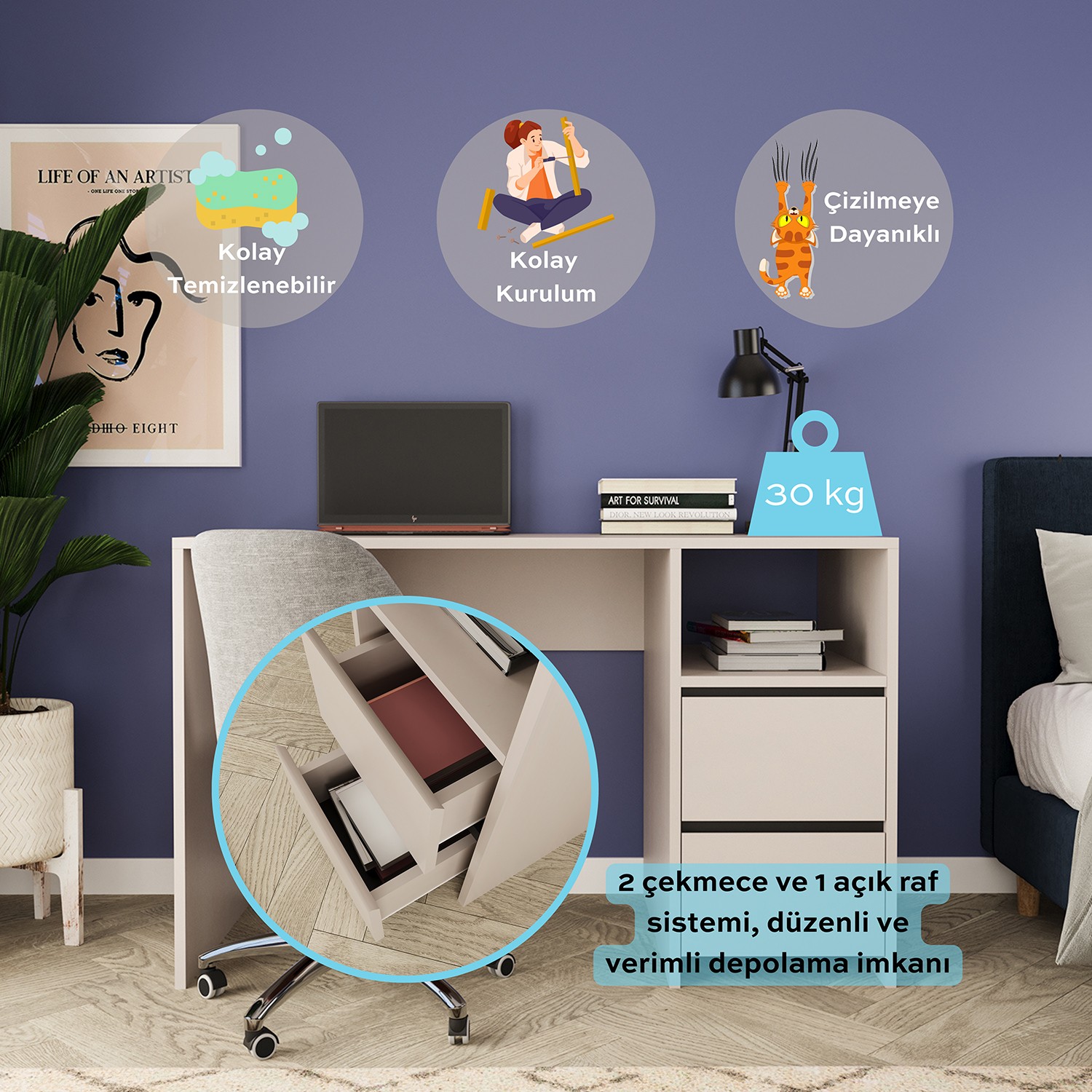 Bu çalışma masasının iki geniş çekmecesi, kâğıt, kalem ve diğer ofis gereçlerinizi düzenli bir şekilde saklamanızı sağlar. Aynı zamanda açık bölmeli tasarım, sık kullandığınız kitaplar, dosyalar veya dekoratif eşyalarınız için harika bir sergileme alanı sunar.