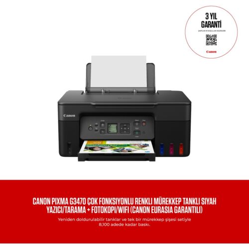 Canon PIXMA G3470 Çok Fonksiyonlu Renkli Mürekkep Tanklı Siyah Yazıcı/Tarama + Fotokopi/Wifi (Canon Eurasia Garantili)
