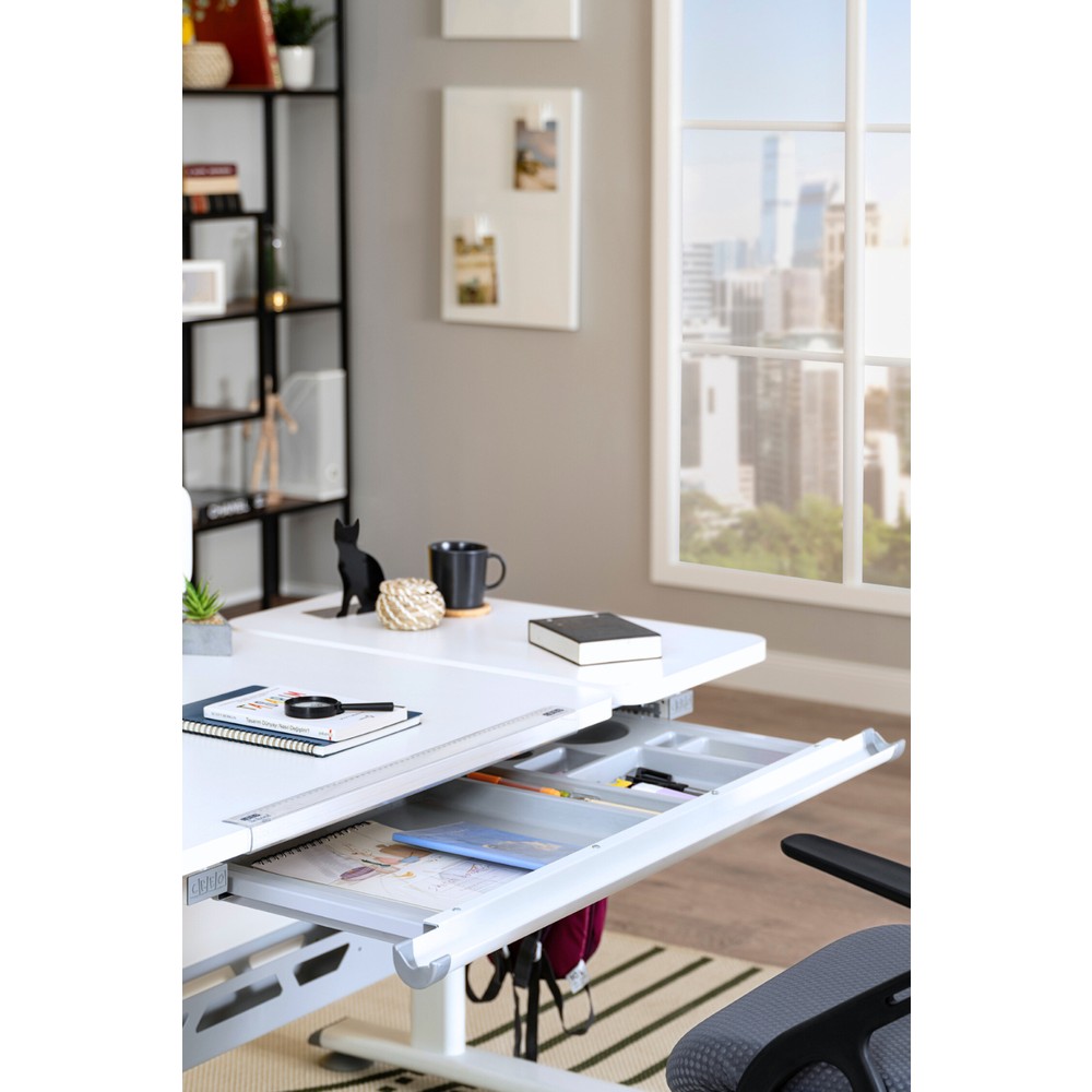 - Eğimli Masa Üst Tablası: Geniş yüzeyli masa tablası 9 kademeli eğim sistemine sahiptir. Çizim, yazı yazma, okuma gibi aktiviteler için farklı açılarda kullanılabilir.