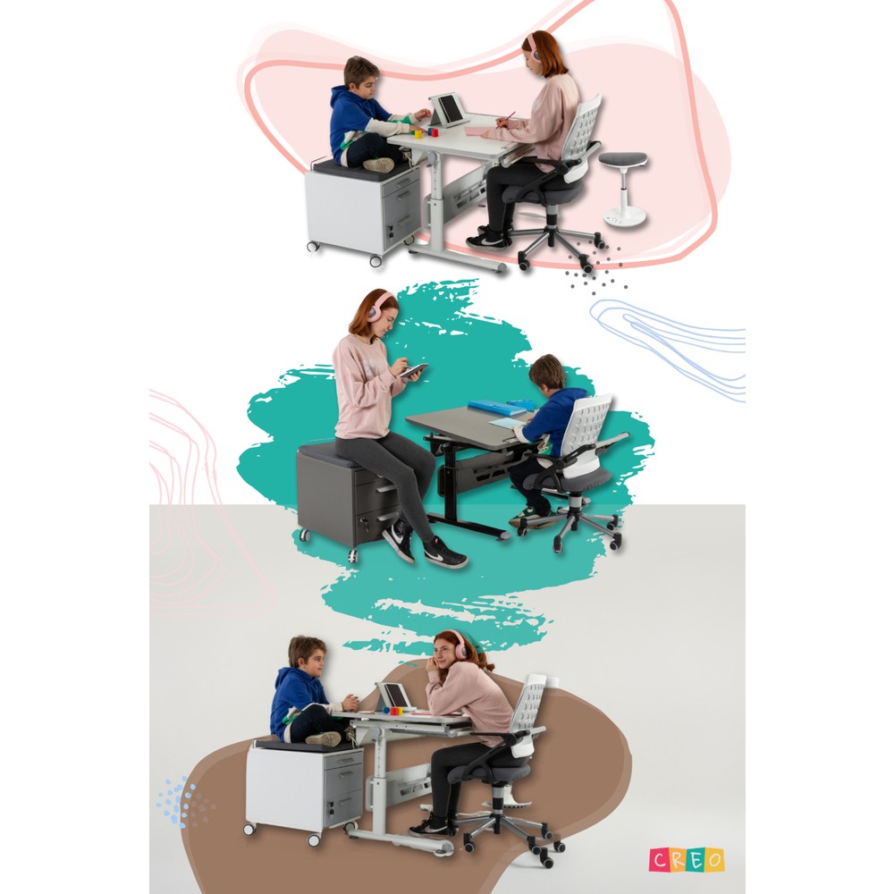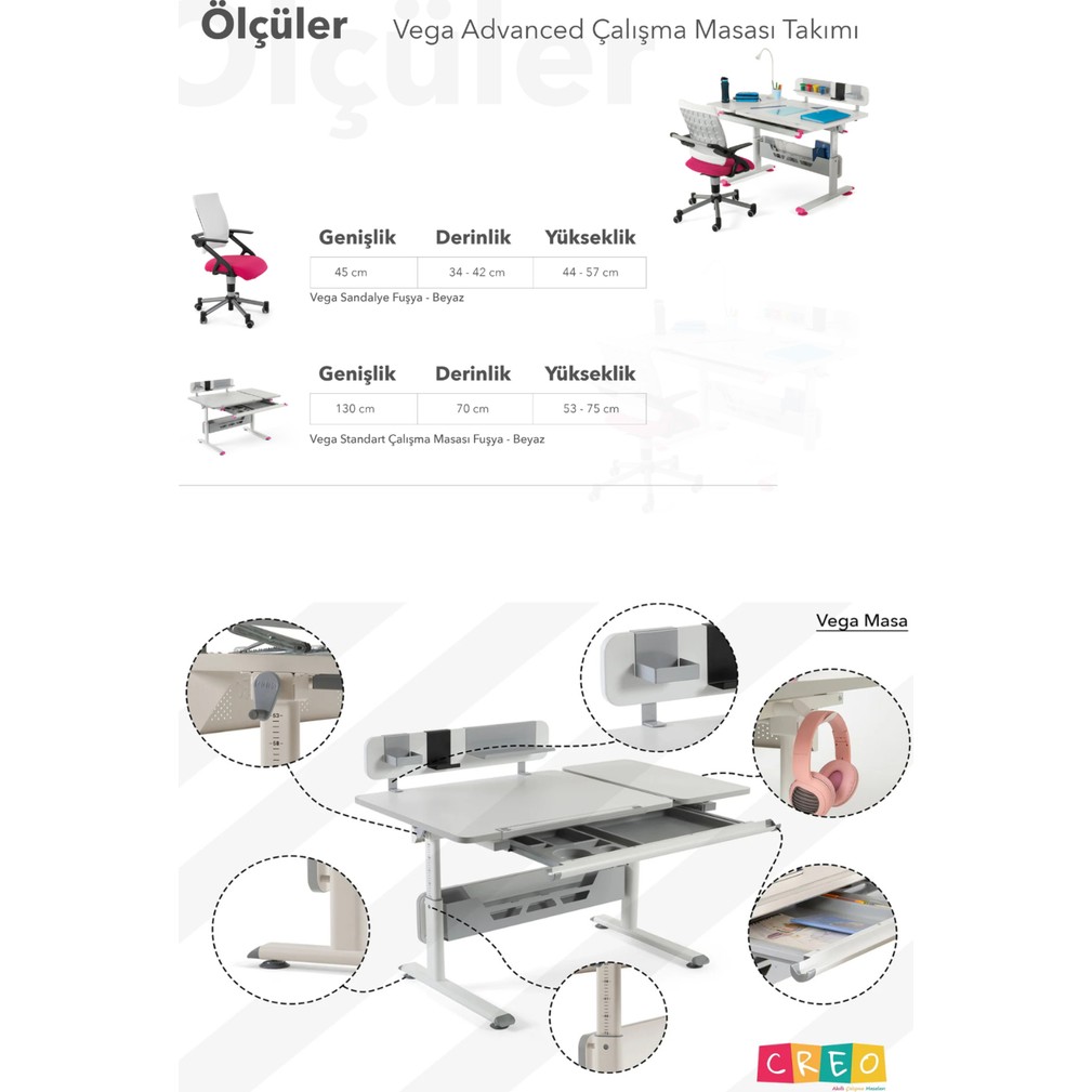 Creo Mobili’nin Vega modeli; estetik ve ergonomik tasarımıyla hem çocukların hem de yetişkin kullanıcıların ihtiyaçlarına cevap veren bir çalışma masası sistemidir. Ayarlanabilir özellikleri ve fonksiyonel detayları sayesinde eğitimden ev ofis ortamlarına kadar geniş bir kullanım alanına sahiptir.