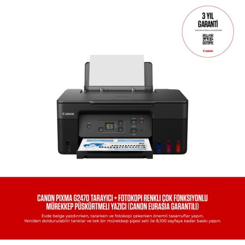 Canon Pixma G2470 Tarayıcı + Fotokopi Renkli Çok Fonksiyonlu Mürekkep Püskürtmeli Yazıcı (Canon Eurasia Garantili)