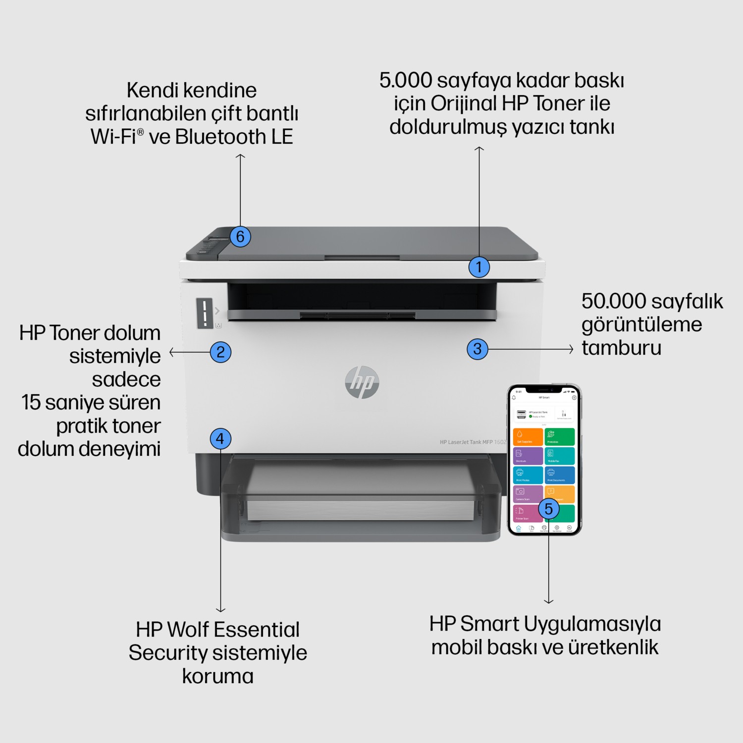 HP LaserJet Tank MFP 1602w Yazıcı, Baskı, Fotokopi, Tarama, Çift bantlı Wi-Fi, Siyah-Beyaz, 2R3E8A