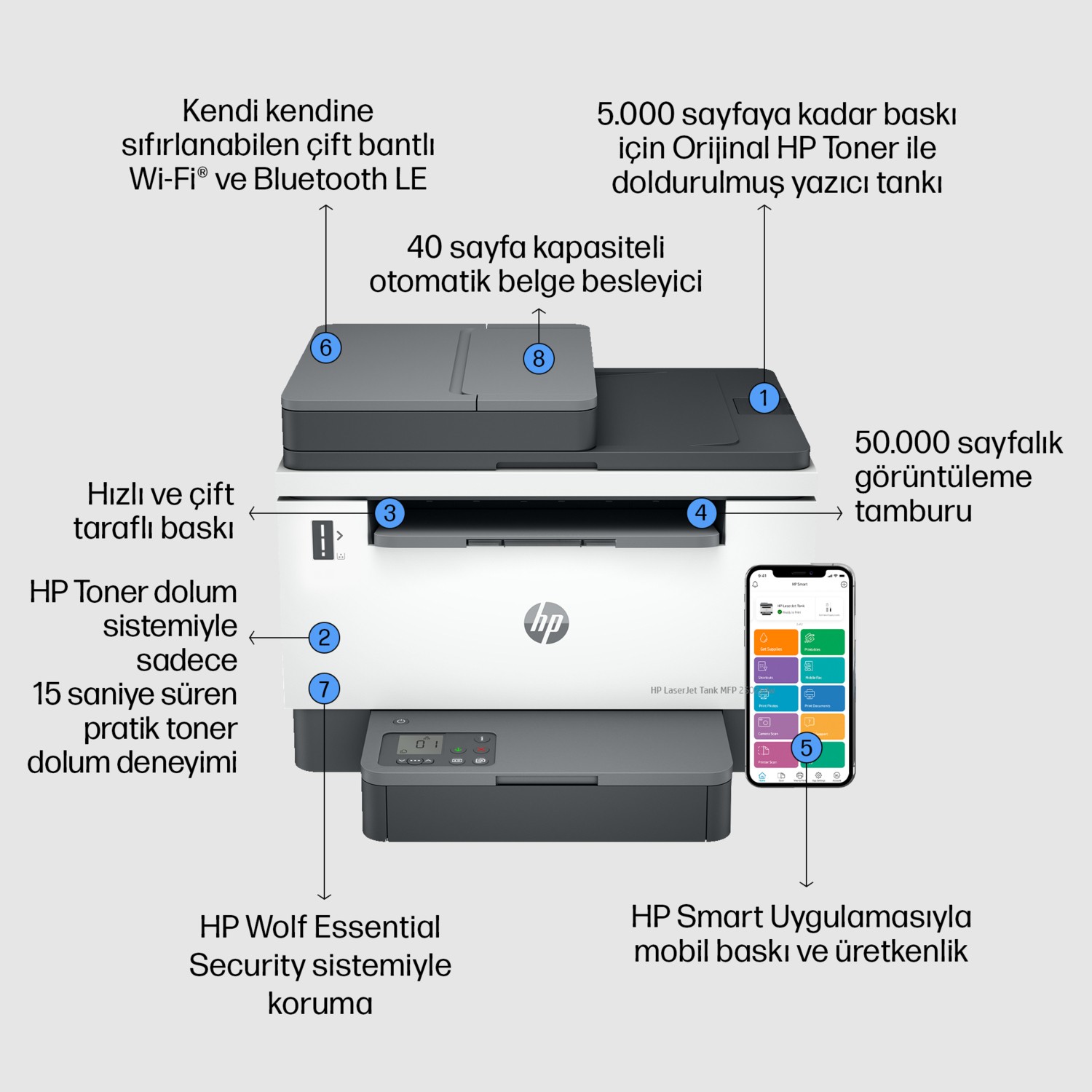 HP LaserJet Tank MFP 2602sdw Mono Yazıcı, USB, Ethernet, Wifi, PDF’ye tarama, Çift Taraflı Tarama, E-Posta Tarama, Scan, Siyah Beyaz, 2R7F5A Özellikleri