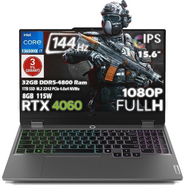 Lenovo LOQ 15IRX9 Intel Core i7 13650HX 32GB 1TB SSD RTX 4060 8GB (115W) 15.6″ FHD 144Hz IPS Panel Freedos Taşınabilir Bilgisayar 83DV00WTTR
