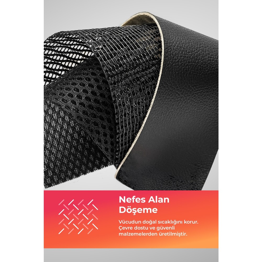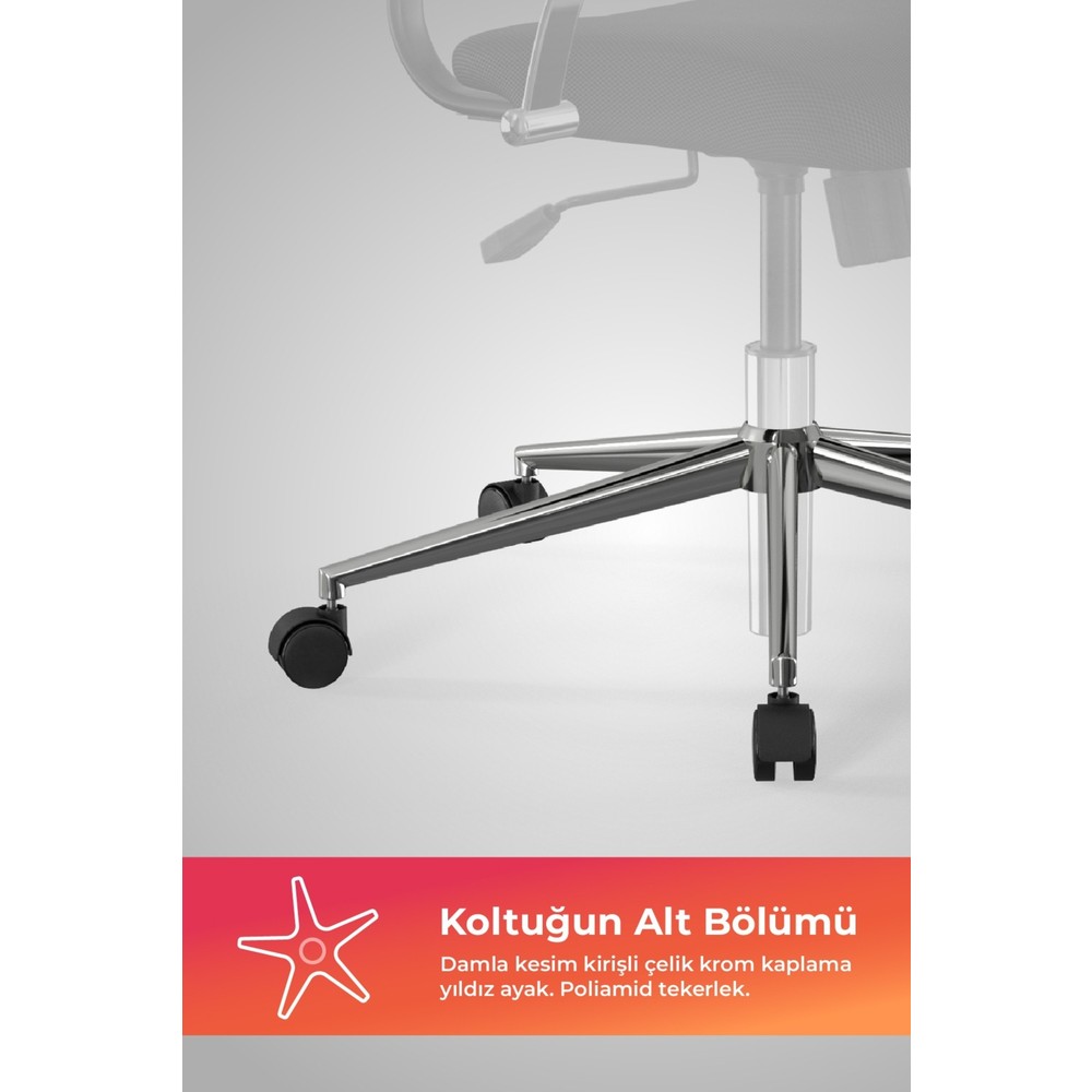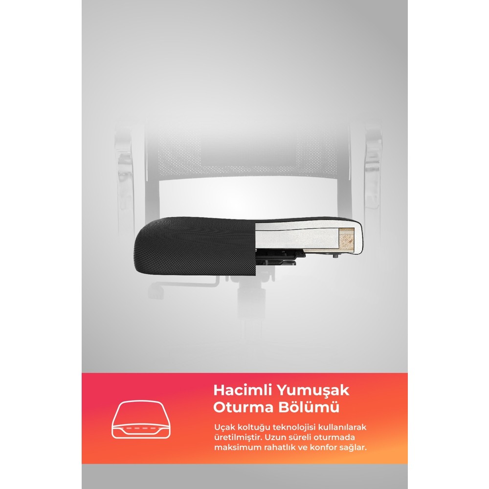 - Döşeme: File sırt bölümü, nefes alan kumaş kaplama oturma bölümü.
