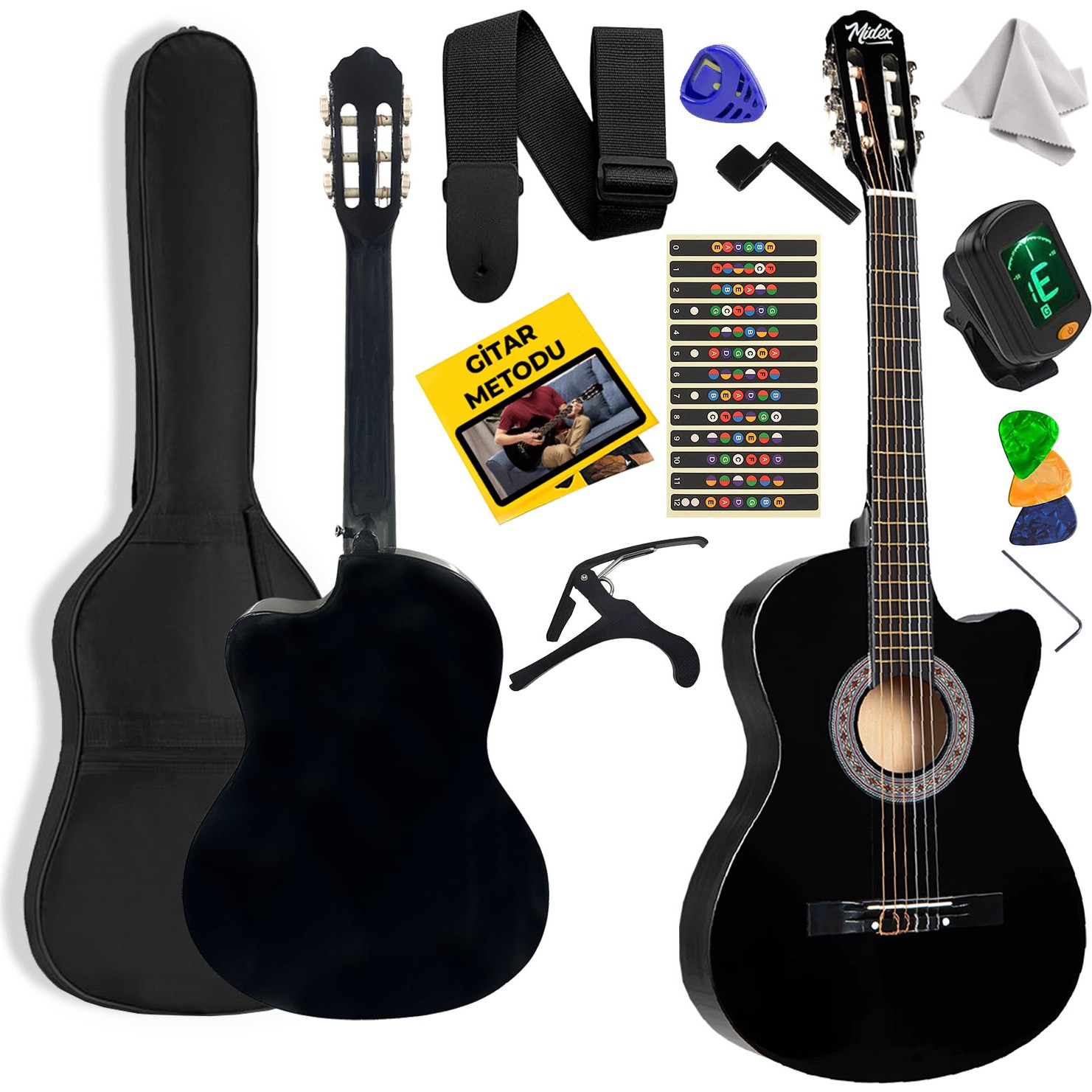 Midex CG-395BK Siyah Klasik Gitar 4/4 Sap Ayarlı Kesik Kasa Full Set (Çanta Askı Tuner Metod Pena)