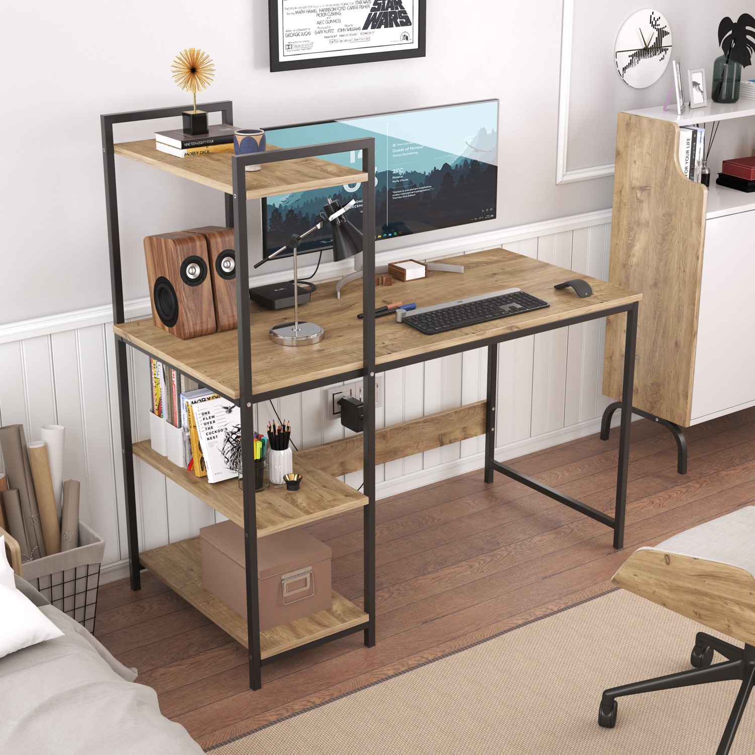 Bimossa Hürrem Kitaplık ve Raflı Çalışma Masası Ceviz Beyaz