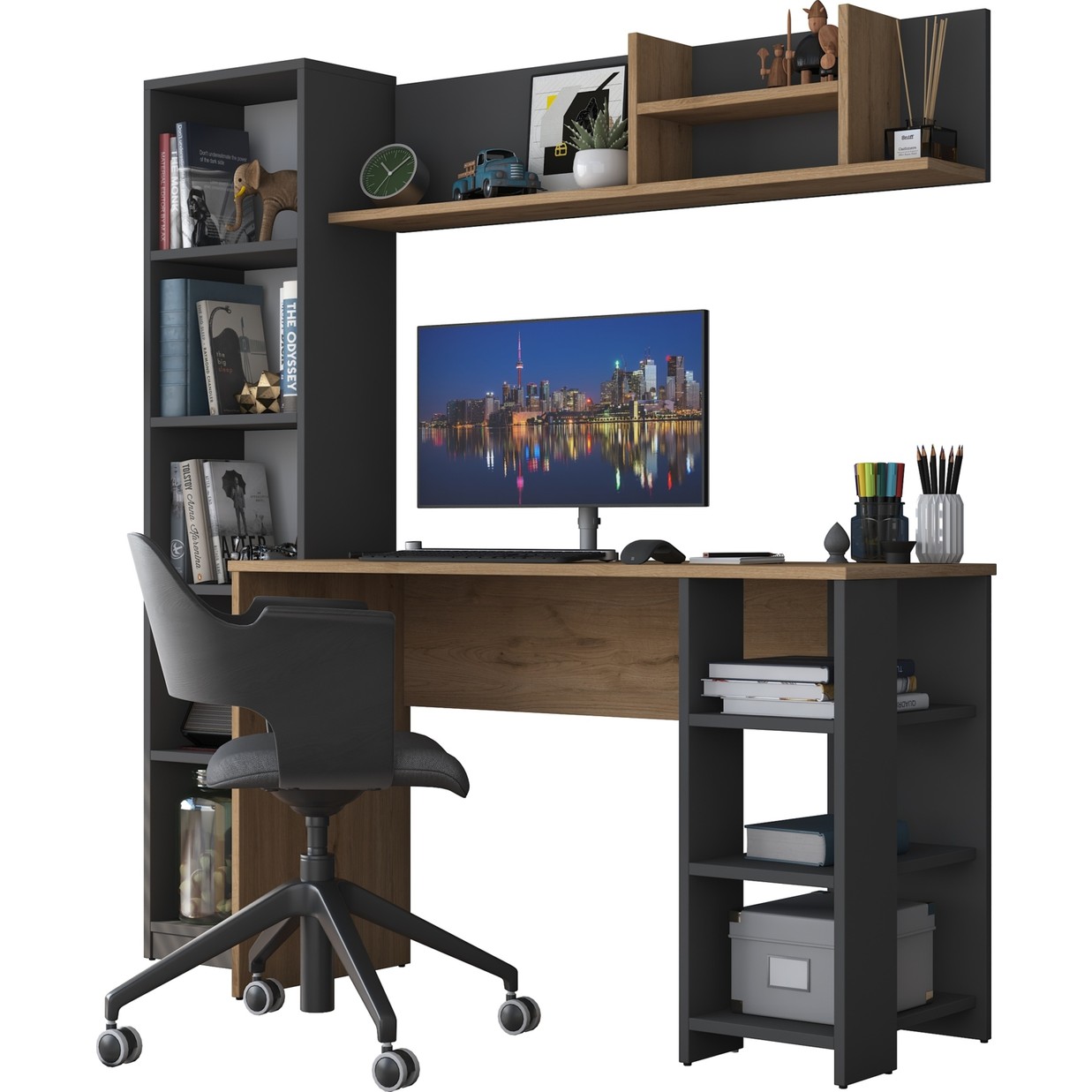 Rani HA125 Kitaplıklı Raflı Çalışma Ofis Bilgisayar Masası Antrasit – Sepet Ceviz