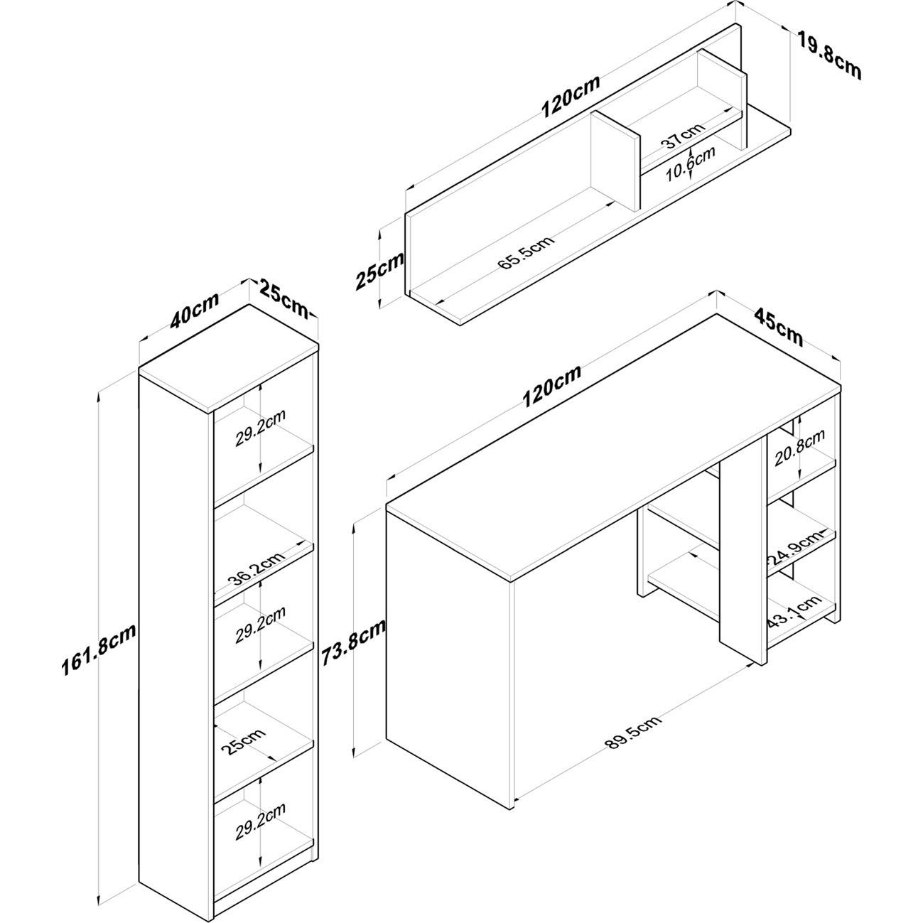 * Ürün; kitaplık, çalışma masası ve duvar rafı olmak üzere 3 ayrı parçadan oluşmaktadır.