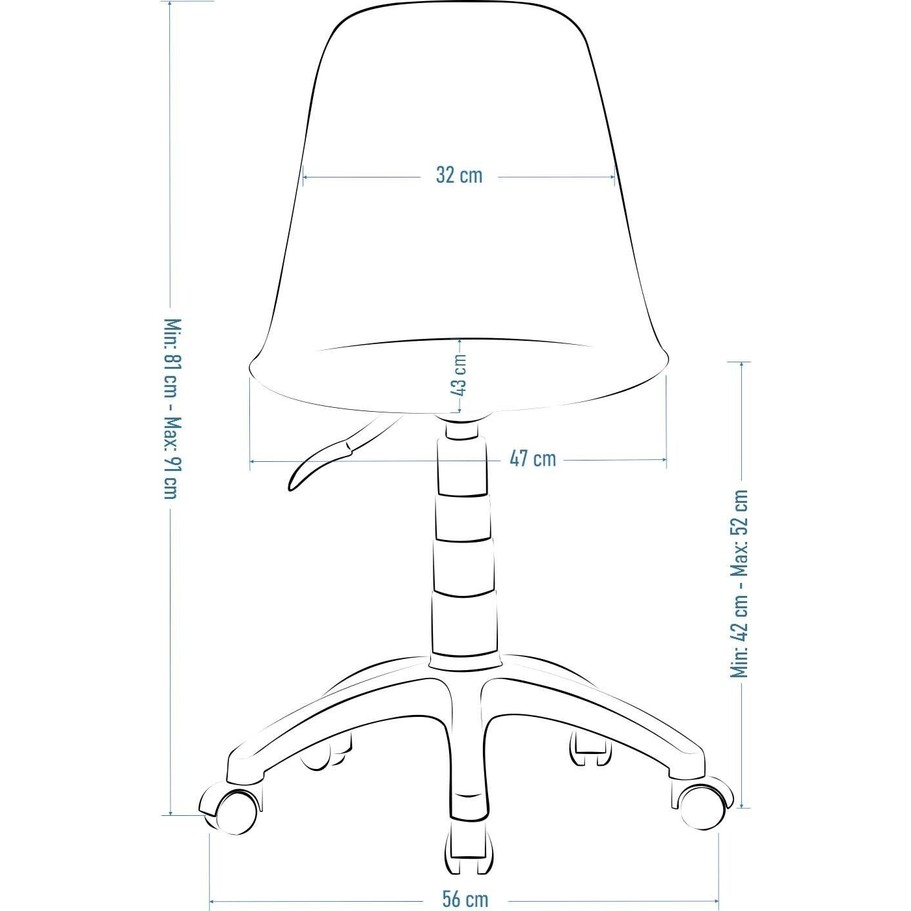 ÜRÜN ÖLÇÜLERİ Toplam Yükseklik Min: 81 cm Toplam Yükseklik Max: 91 cm Oturum Yüksekliği Min: 42 cm Oturum Yüksekliği Max: 52 cm Oturum Genişliği: 47 cm Oturum Derinliği: 43 cm Ayak Çapı: 56 cm Ağırlık: 8 kg MALZEME ÖZELLİKLERİ Ayak: Plastik Döner Tekerli Oturak Rengi: Mat Beyaz Ayak Rengi: Mat Beyaz Oturak Özelliği: %25 Fiber Glass Taşıma Kapasitesi: 130 kg Ürün uzun ömürlüdür, sararma yapmaz. Yerli üretimdir. Ürün üst üste istiflenemez. Kurulum Şeması ile müşteri tarafından kurulur. (Tornavida yeterlidir.) 2 Yıl TSE garantilidir.